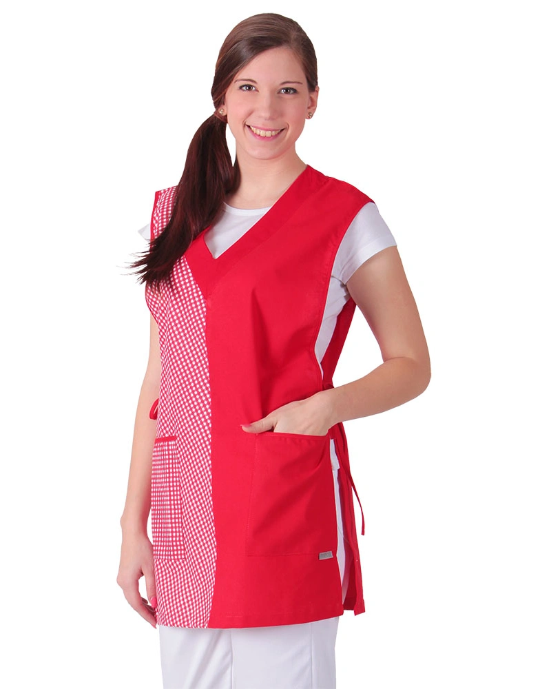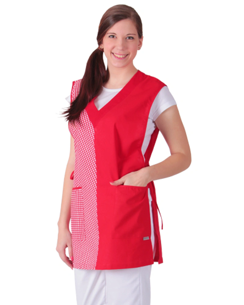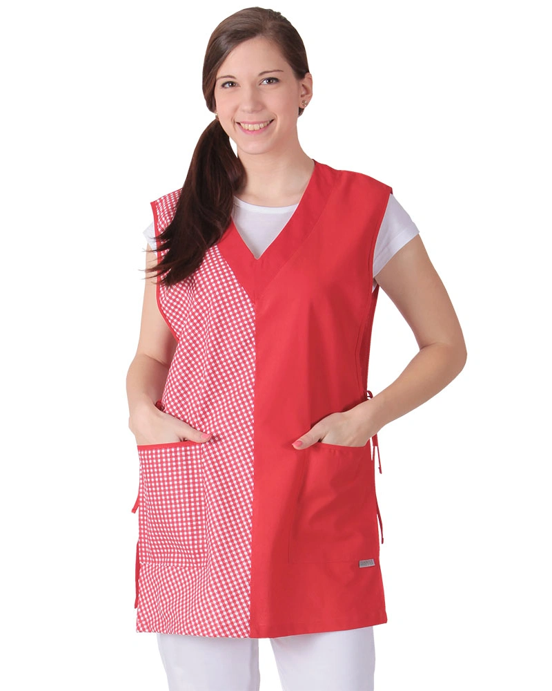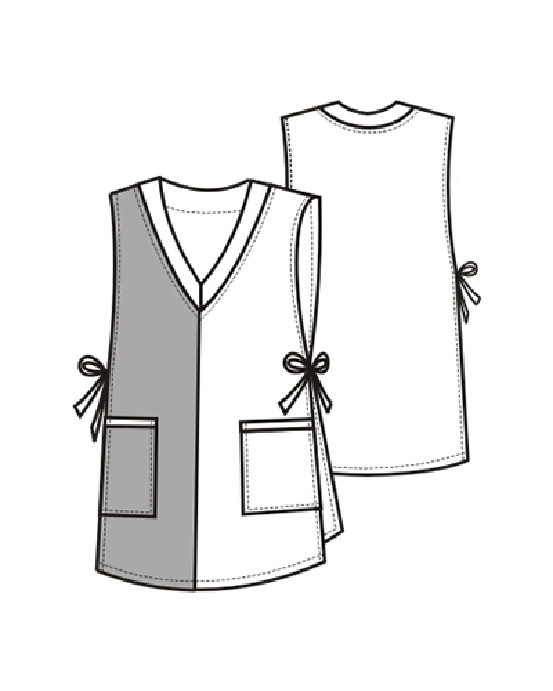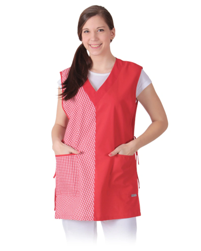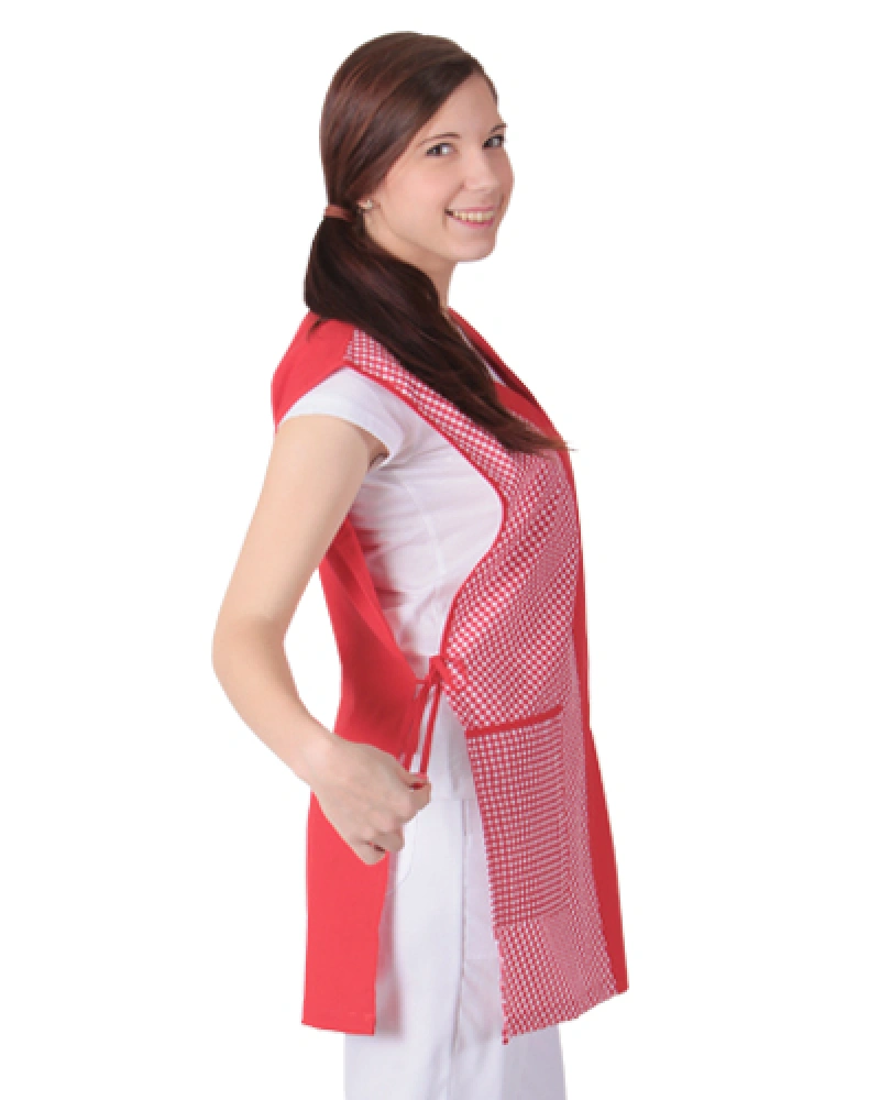 Zástěra přes hlavu s výstřihem do špičky - klokánka. Přední díly barevně kombinované s nakládanými kapsami. Zavazování na bocích.Více informací