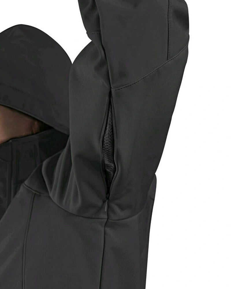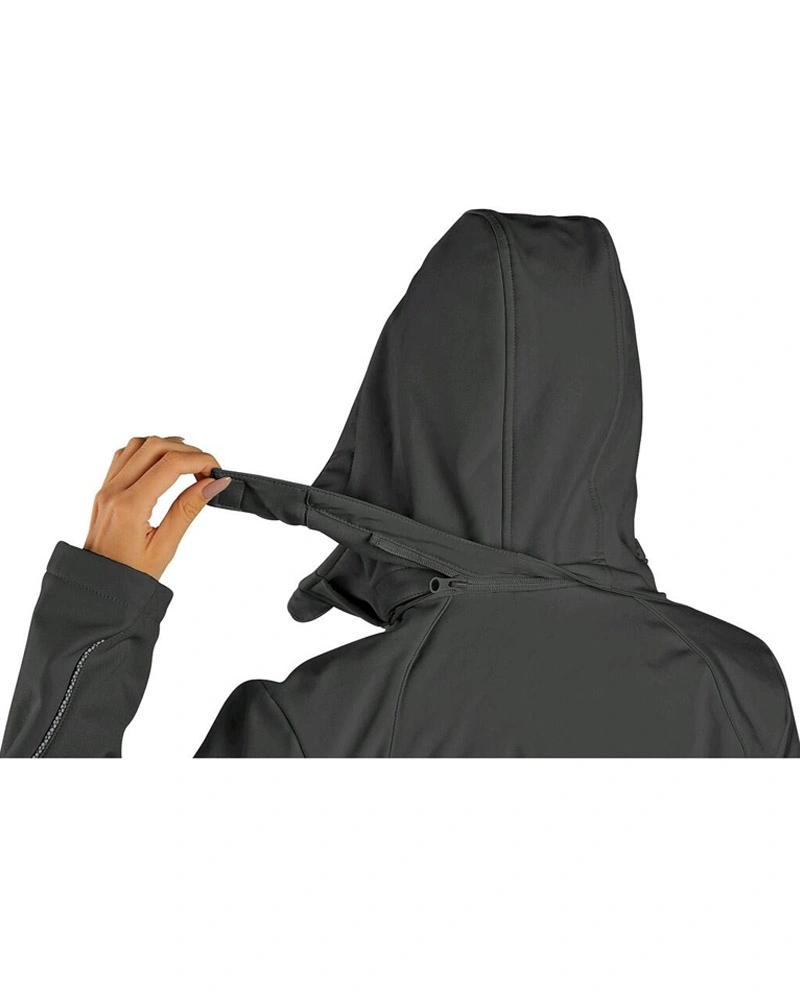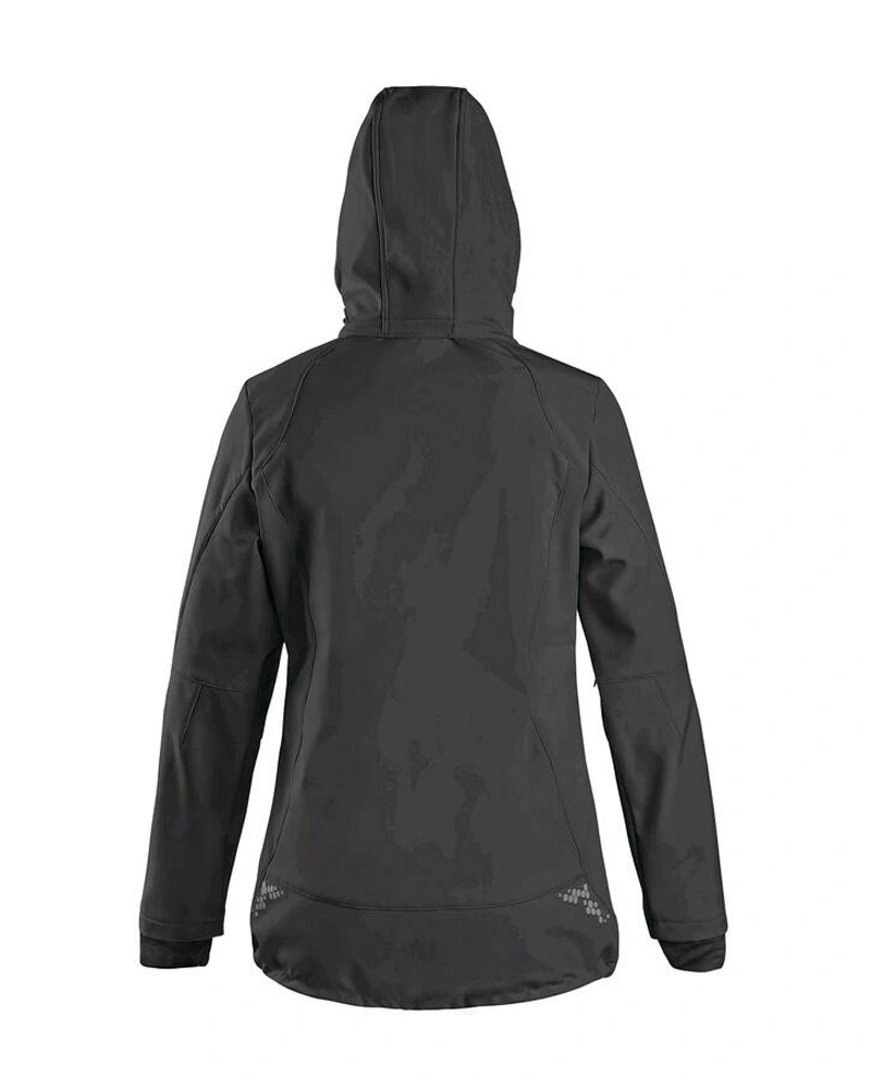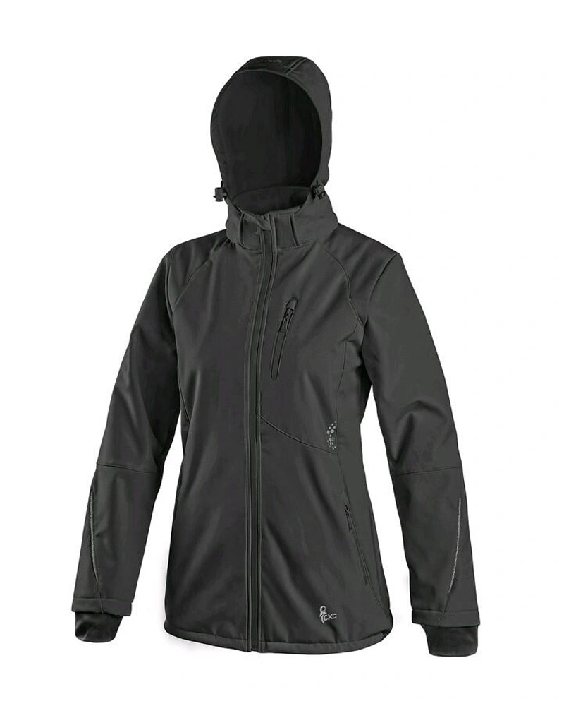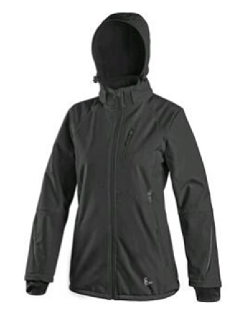 Dámská softshellová bunda s odepínací kapucí, odolná proti vodě a větru, zapínaní na zip, větrání v podpaží, náprsní kapsa na zip, boční kapsy na zip, rukávy s vnitřními manžetami, stahování v dolním okraji, reflexní doplňky, TPU membrána.