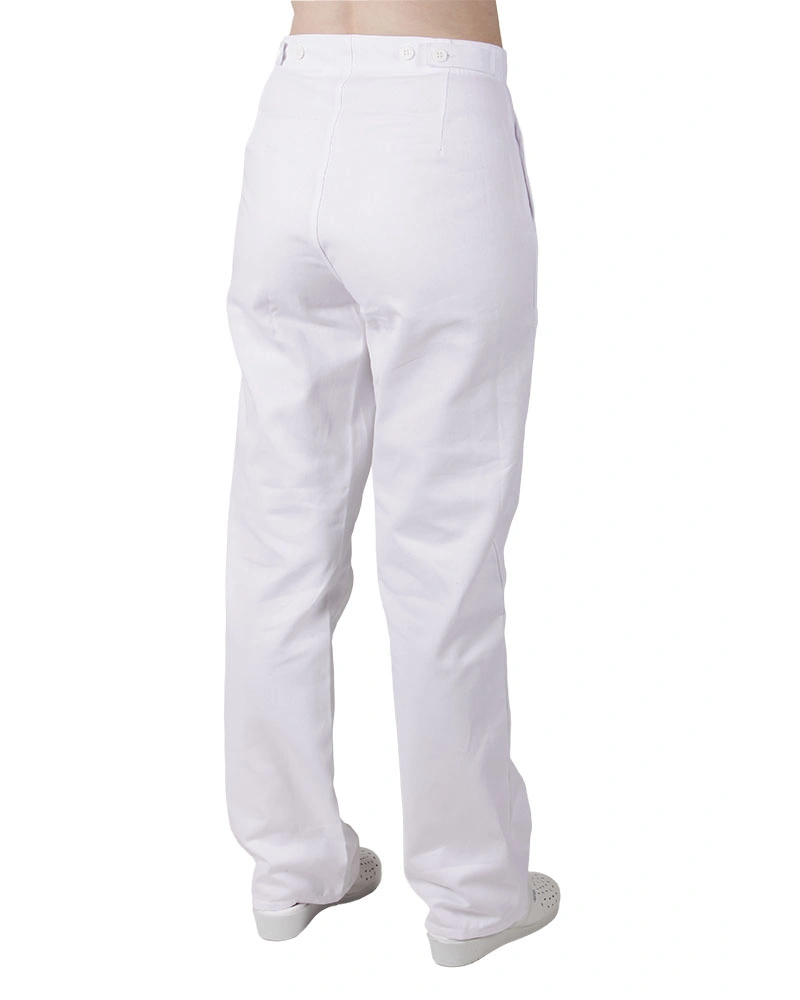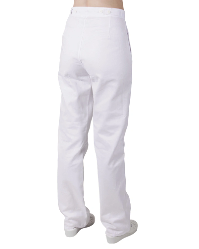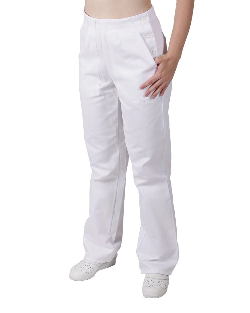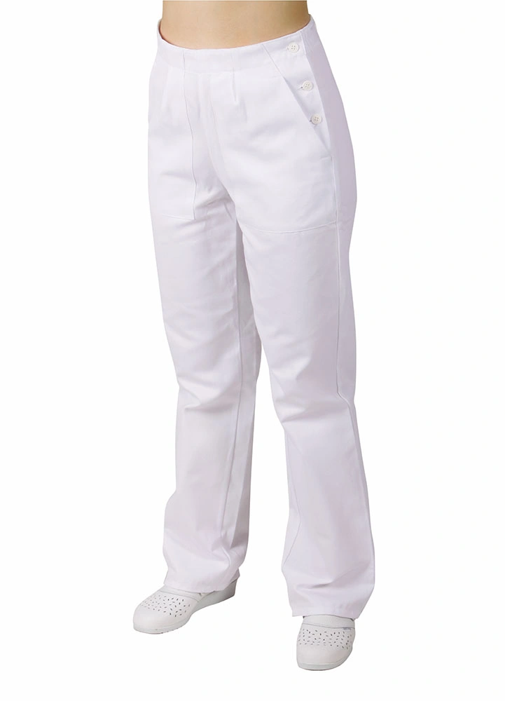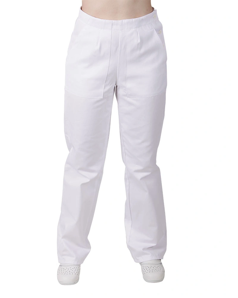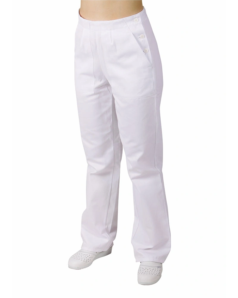 Dámské kalhoty pro lékaře a zdravotníky z elastického materiálu se sníženým pasem, v pase je patent s tkanicí, falešný rozparek, boční kapsy váčkové, zadní kapsy nakládané.