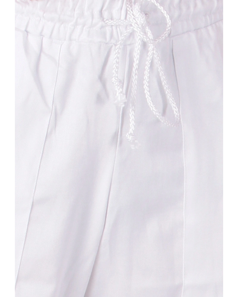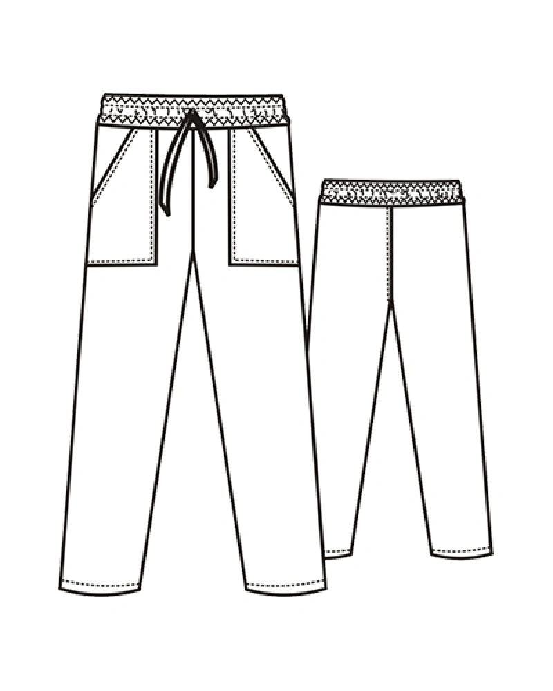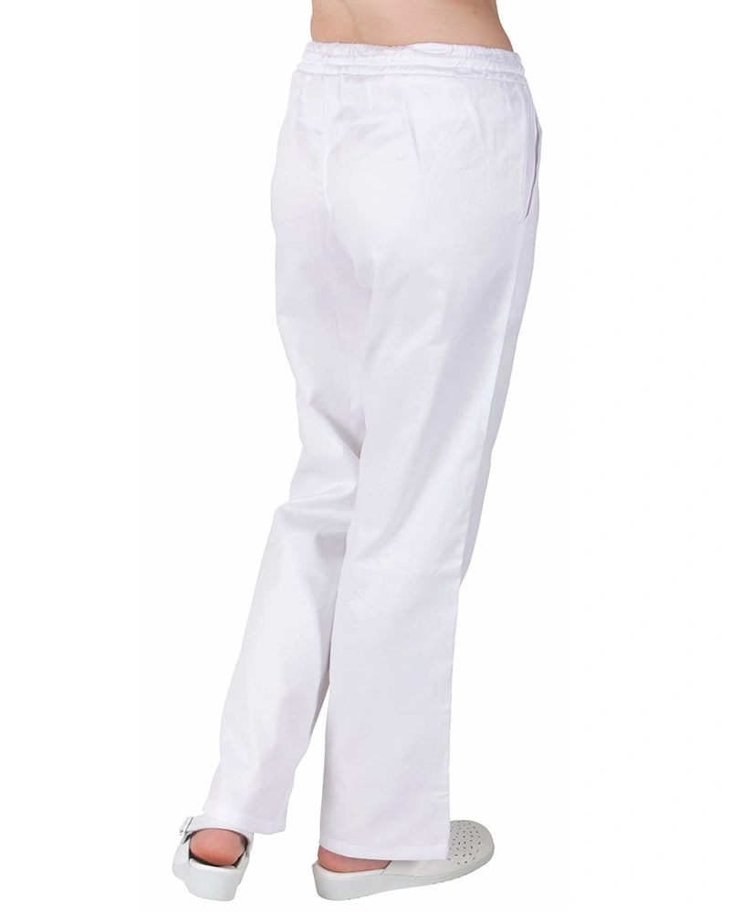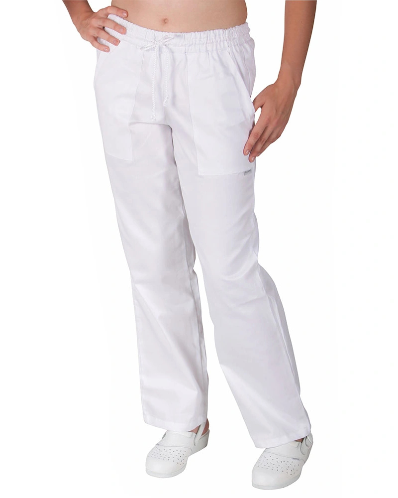 Kalhoty pro lékaře a zdravotníky do pásku se stahovačkami na knofliky. Rozparek na knoflíky. Boční kapsy ve švu. Zadní kapsa na knoflík.