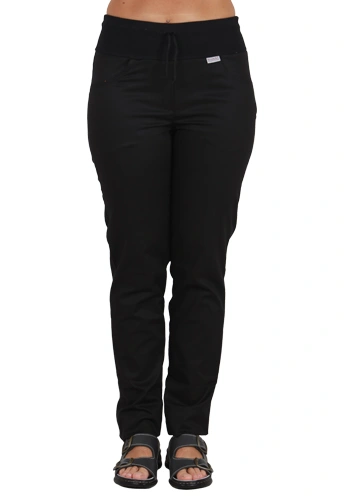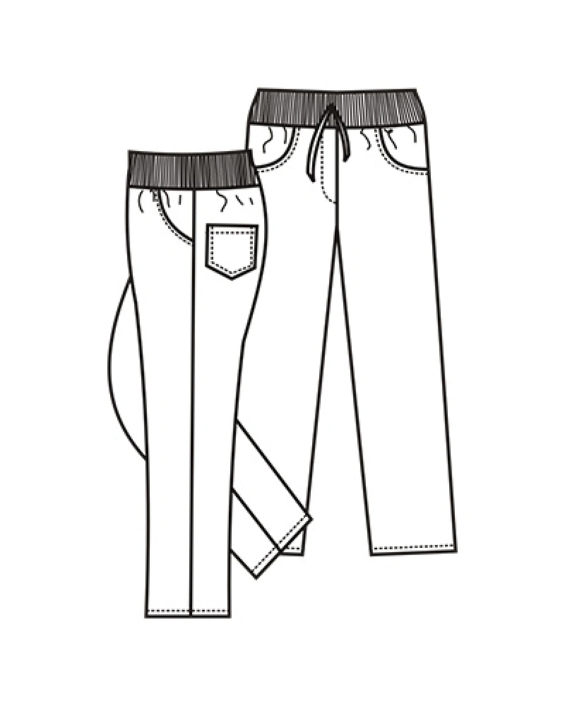 Dámské kalhoty z elastického materiálu se sníženým pasem, v pase je patent s tkanicí, falešný rozparek, boční kapsy váčkové, zadní kapsy nakládané.Více informací