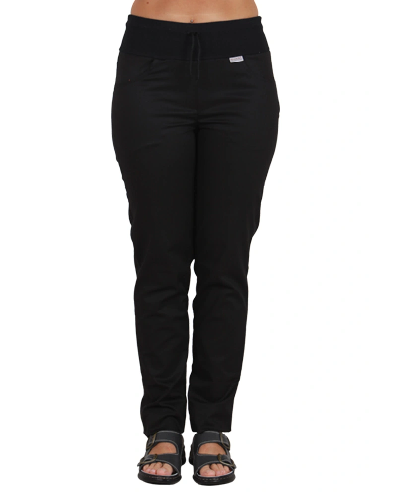 Dámské kalhoty do pasu s předním zapínáním na uzávěr, v zadním pásku guma, boční kapsy, konfekční velikosti.