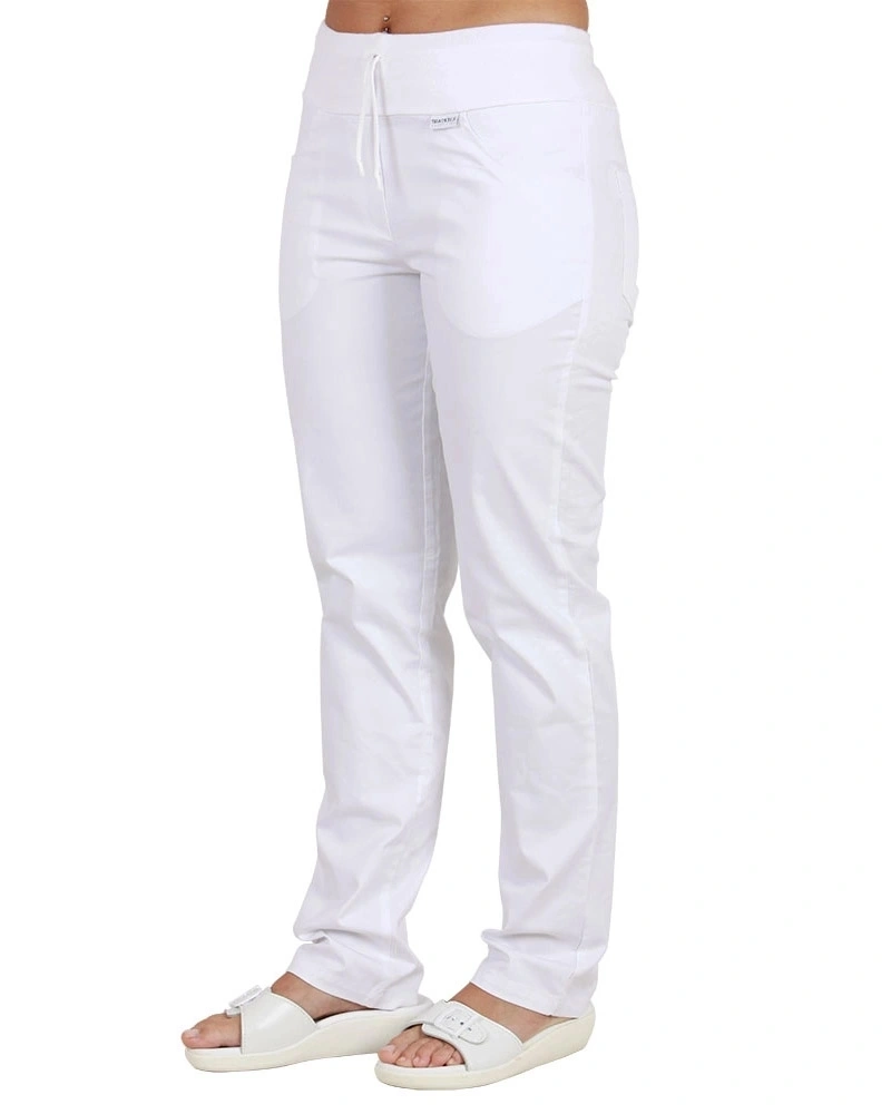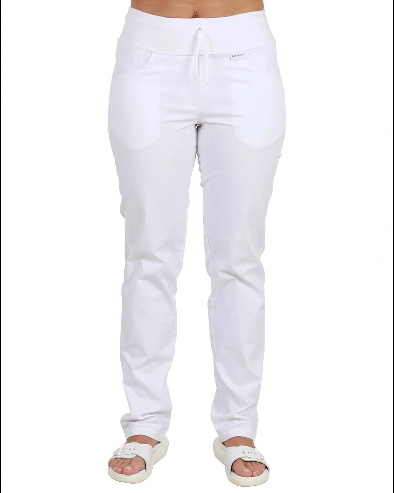 Kalhoty pro kuchaře se sníženým pasem. Pásek s pruženkou a tkanicí. Boční nakládané kapsy. Bez rozparku.