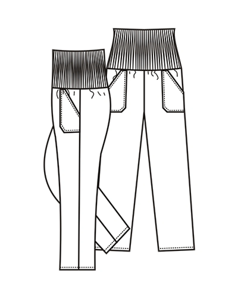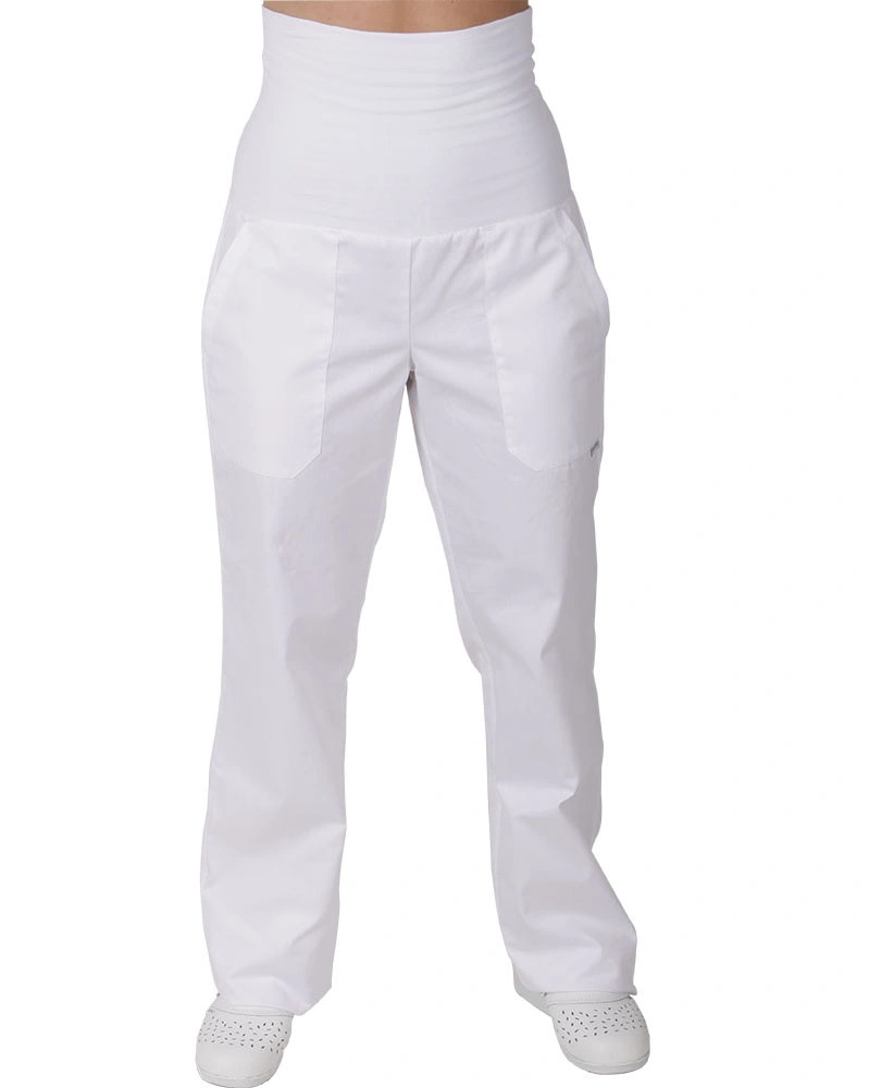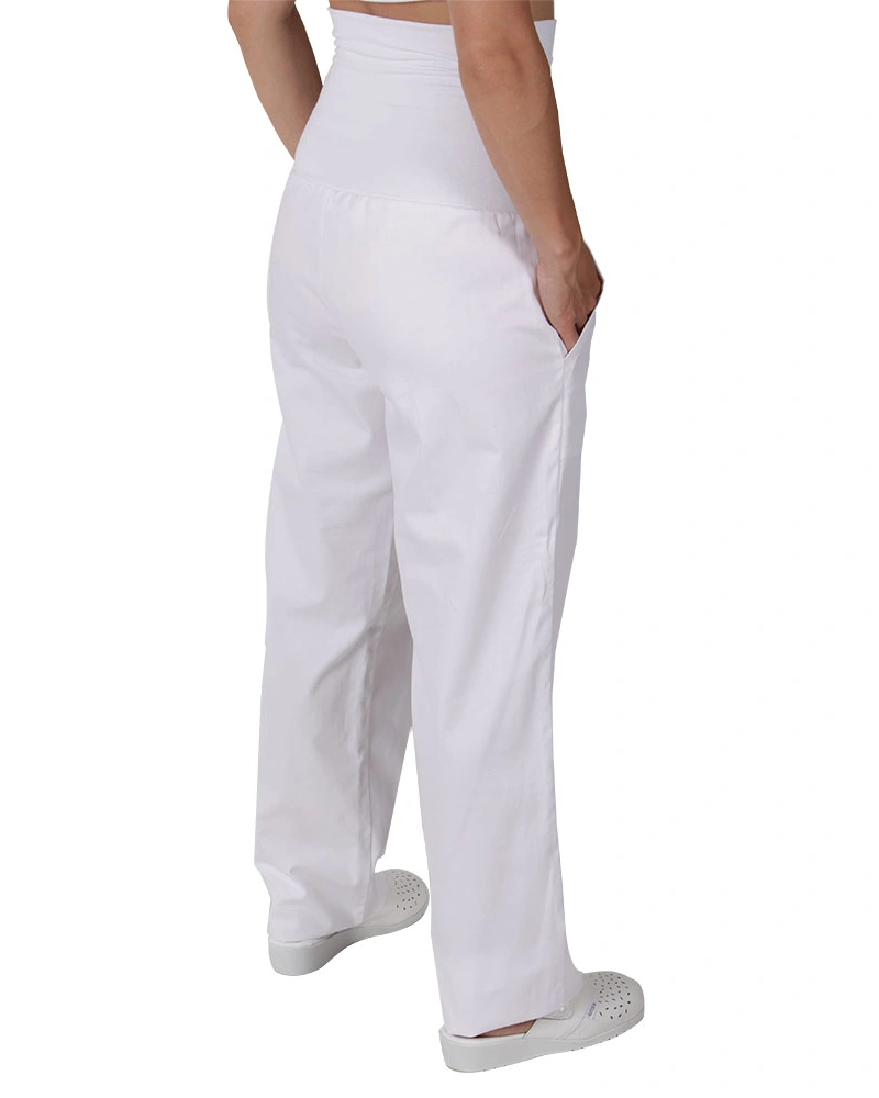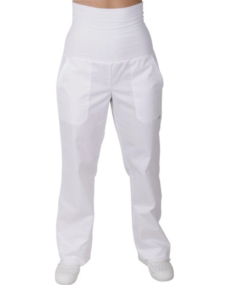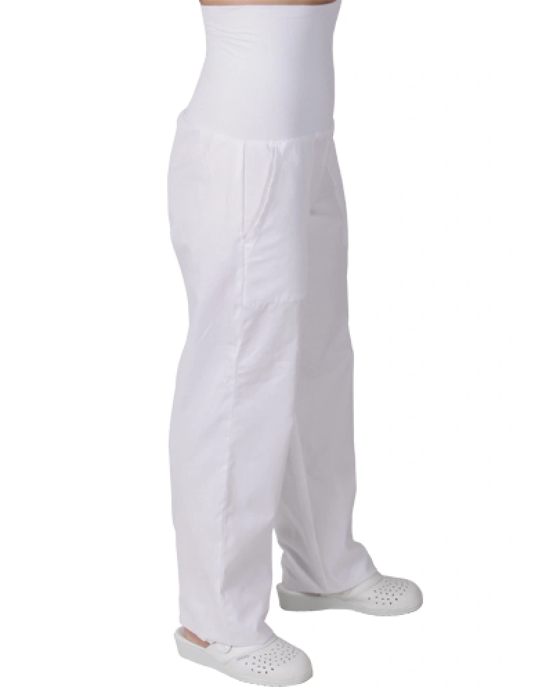 Kalhoty pro lékaře a zdravotníky do pásku se stahovačkami na knofliky. Rozparek na knoflíky. Boční kapsy ve švu. Zadní kapsa na knoflík.