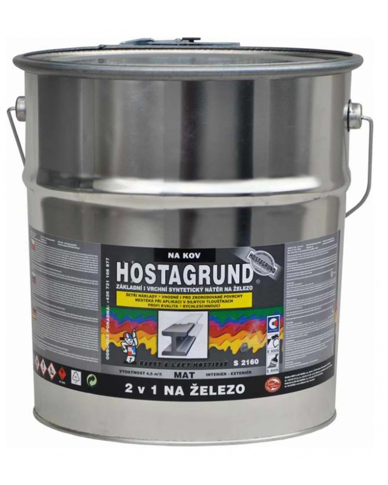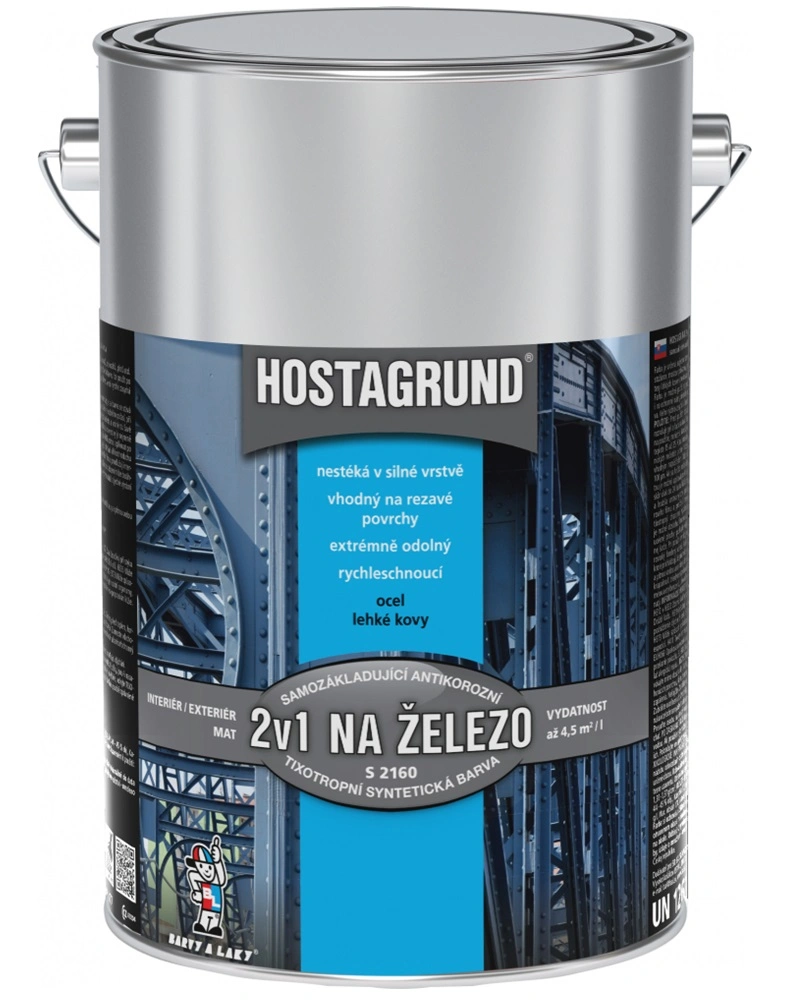 HOSTAGRUND 2v1 NA ŽELEZO S2160 je základní i vrchní syntetický nátěr na železo. Určen pro zhotovení jednovrstvých venkovních nátěrů ocelových konstrukcí, např. stožárů, mostů, podvozků, plotů, vystavených přímým povětrnostním vlivům. Barvu lze použít i pro ochranné nátěry nekovových podkladů, např. beton, dřevo. Barva má tixotropní charakter, který spolu se speciálním složením umožňuje dosažení silné vrstvy a ochranných vlastností jedním nátěrem. Nanáší se přímo na podklad, zbavený mechanických nečistot a rzi.