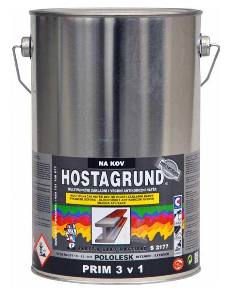 Multifunkční základní i vrchní antikorozní polomatná barva na kov. Jednovrstvá polomatná barva spojující vlastnosti základního antikorozního nátěru, mezivrstvy a současně vrchní barvy. Je určena k přímým nátěrům kovů ve venkovním i vnitřním prostředí. Barva na kov je ideální pro nátěry ocelových materiálů, zoxidovaných a čerstvých pozinkovaných povrchů jako např. střechy, kovové konstrukce, stožáry, ploty, sloupy, vrata apod. Barvu na kov je možné použít i pro nátěr savých podkladů jako např. dřevo a dřevotříska. Barva na kov HOSTAGRUND není určena k nátěrům, které přicházejí do přímého styku s potravinami, krmivy a pitnou vodou a k nátěrům dětského nábytku a hraček.