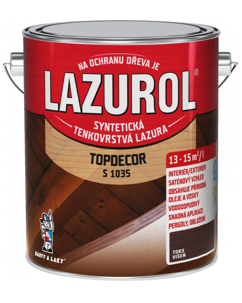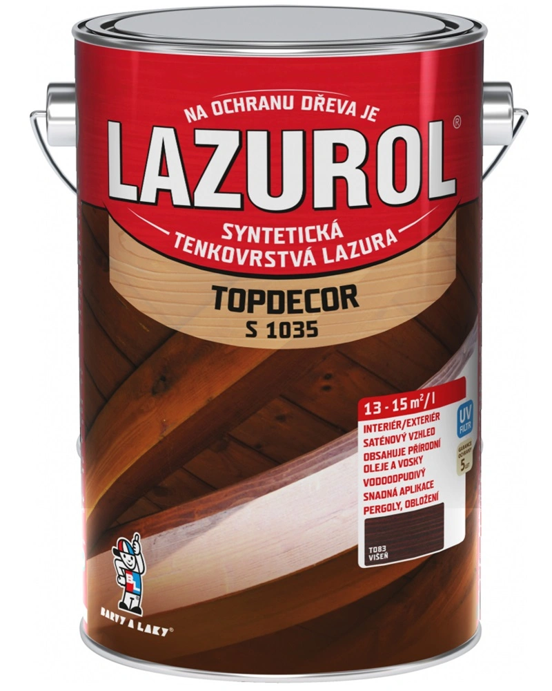 Lazurol Topdecor S1035 tenkovrstvá lazura na dřevo je určena k ochranným lazurovacím nátěrům měkkého i tvrdého dřeva, vystaveného povětrnostním vlivům, i k nátěrům v interiérech (zahradní nábytek, dřevěné štíty, podhledy, obložení stěn a stropů, ploty, chaty a dřevěné domky, okna, dveře, korek, penetrace dřevěných podlah ). Lazura na dřevo obsahuje vosk, přírodní olej a transparentní oxidy železa. Hluboce proniká do struktury dřeva a zdůrazňuje jeho strukturu. Poskytuje dlouhodobou ochranu dřeva proti vodě a UV záření. Nátěry jsou stálobarevné, snadno obnovitelné a nepraskají.
