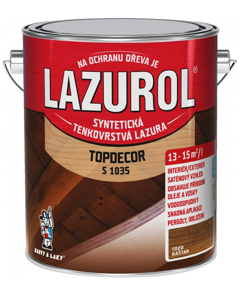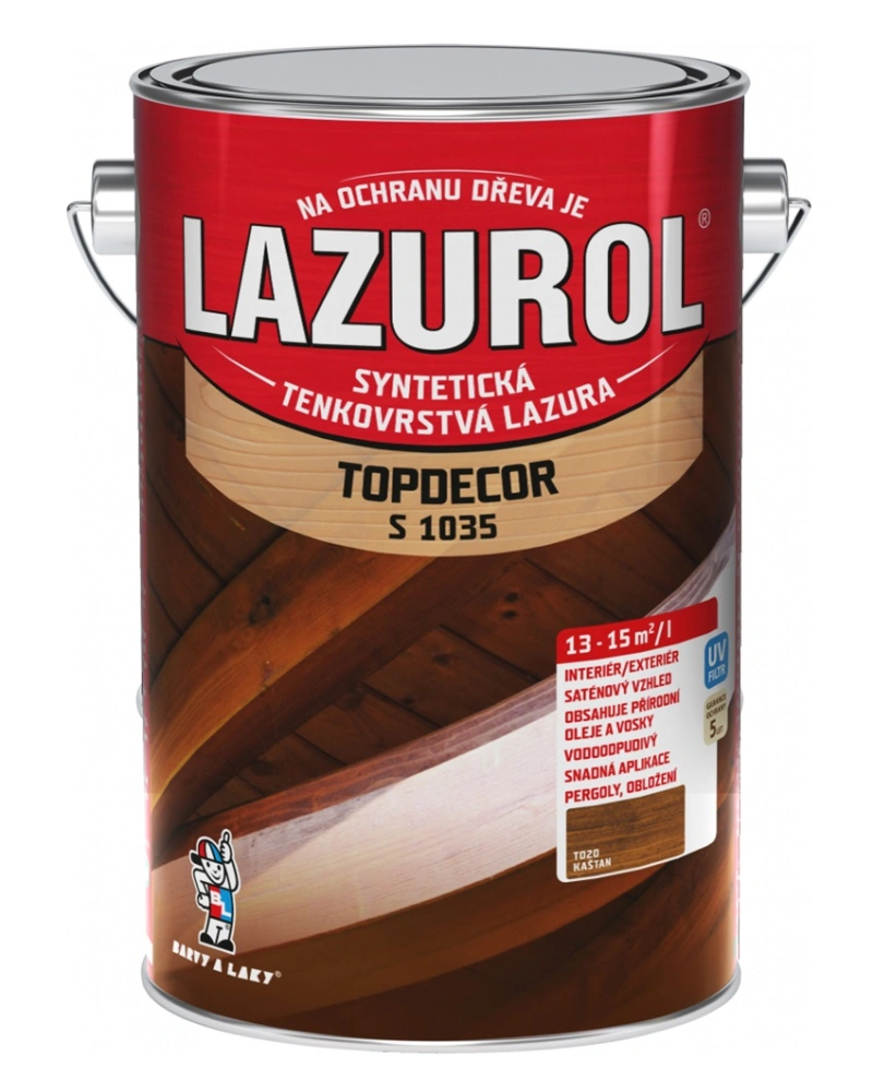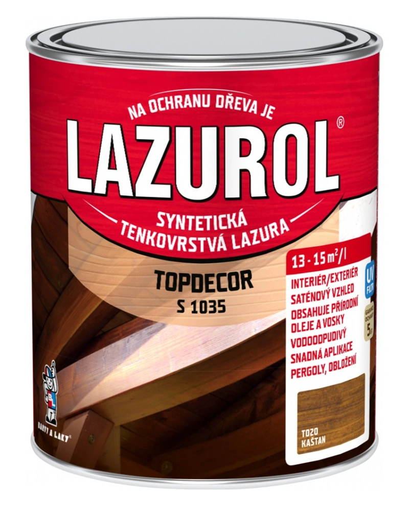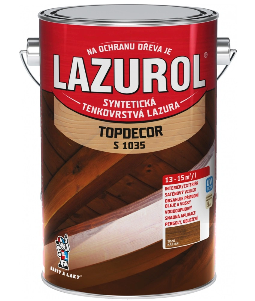 Lazurol Topdecor S1035 tenkovrstvá lazura na dřevo je určena k ochranným lazurovacím nátěrům měkkého i tvrdého dřeva, vystaveného povětrnostním vlivům, i k nátěrům v interiérech (zahradní nábytek, dřevěné štíty, podhledy, obložení stěn a stropů, ploty, chaty a dřevěné domky, okna, dveře, korek, penetrace dřevěných podlah ). Lazura na dřevo obsahuje vosk, přírodní olej a transparentní oxidy železa. Hluboce proniká do struktury dřeva a zdůrazňuje jeho strukturu. Poskytuje dlouhodobou ochranu dřeva proti vodě a UV záření. Nátěry jsou stálobarevné, snadno obnovitelné a nepraskají.