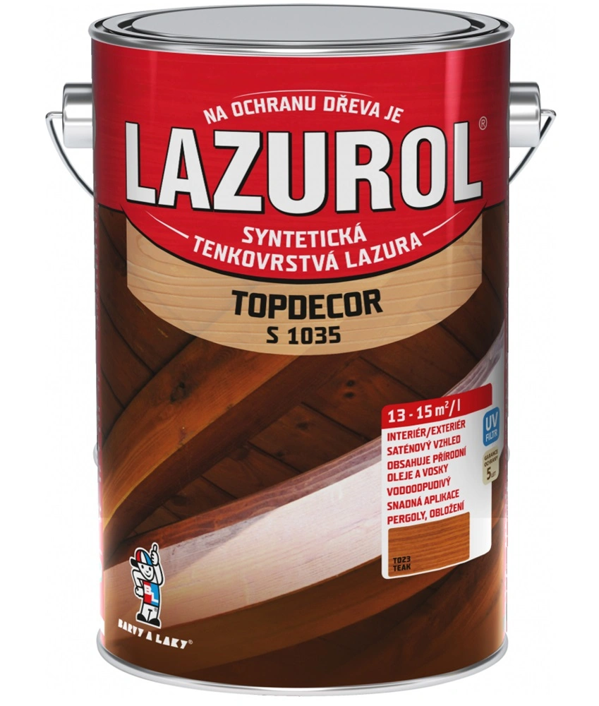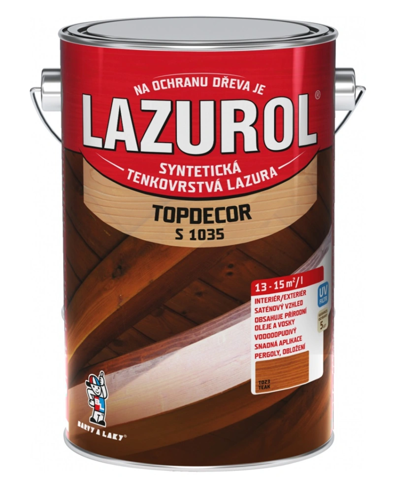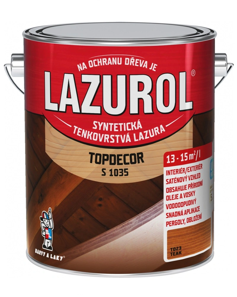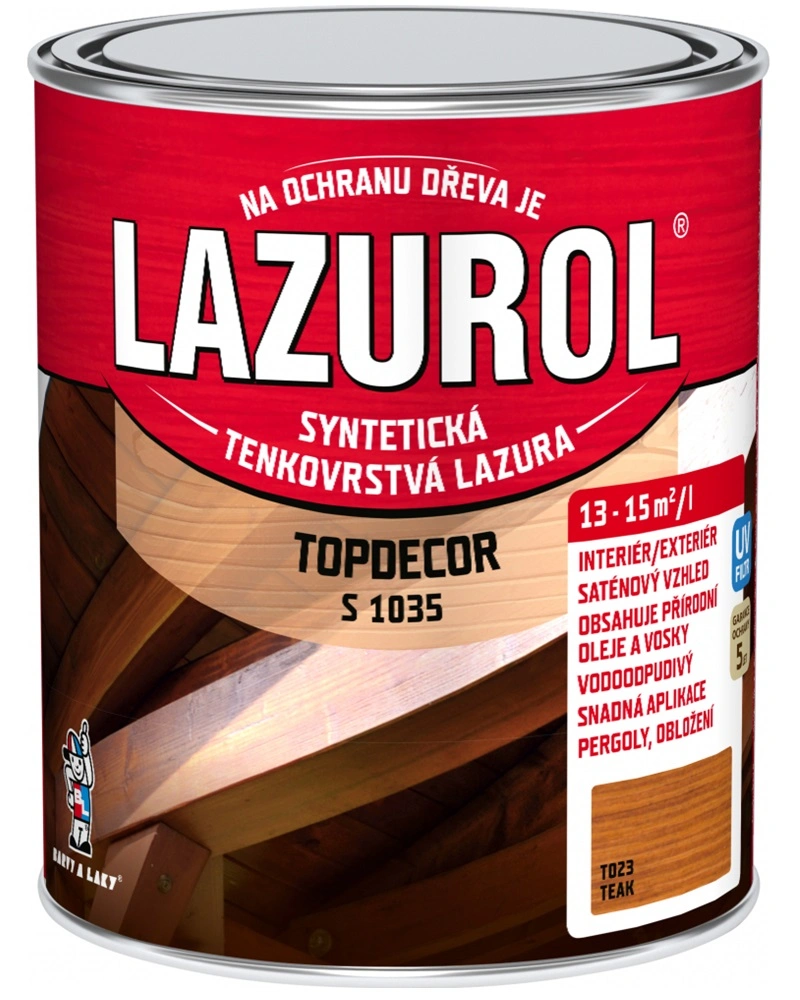 Lazurol Topdecor S1035 tenkovrstvá lazura na dřevo je určena k ochranným lazurovacím nátěrům měkkého i tvrdého dřeva, vystaveného povětrnostním vlivům, i k nátěrům v interiérech (zahradní nábytek, dřevěné štíty, podhledy, obložení stěn a stropů, ploty, chaty a dřevěné domky, okna, dveře, korek, penetrace dřevěných podlah ). Lazura na dřevo obsahuje vosk, přírodní olej a transparentní oxidy železa. Hluboce proniká do struktury dřeva a zdůrazňuje jeho strukturu. Poskytuje dlouhodobou ochranu dřeva proti vodě a UV záření. Nátěry jsou stálobarevné, snadno obnovitelné a nepraskají.
