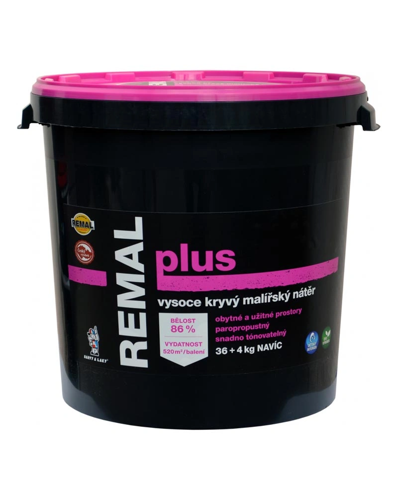 Vysoce kryvý malířský nátěr doporučen pro nátěry obytných a užitných prostor. Používá se k malování stěn i stropů v interiéru na omítky, sádrokartony a jiné podklady. Je snadno zpracovatelný, zdravotně nezávadný a ekologicky příznivý. REMAL PLUS je přírodní vodouředitelná malířská barva. Výborně kryje, je prodyšná, má zvýšenou otěruvzdornost a vysokou bělost 86 %. Používá se k malování omítek, betonu, sádrokartonu, cetris desek, dřevotřísky i sanačních omítek v interiérech. Barva vykazuje odolnost proti oděru za mokra – měřeno dle ČSN EN ISO 11998 – třída 5. (klasifikace dle EN 13300).