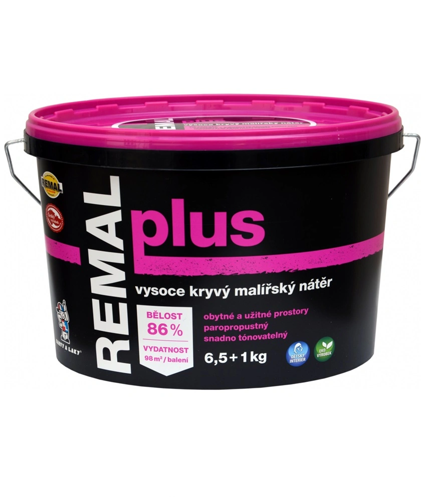 Vysoce kryvý malířský nátěr doporučen pro nátěry obytných a užitných prostor. Používá se k malování stěn i stropů v interiéru na omítky, sádrokartony a jiné podklady. Je snadno zpracovatelný, zdravotně nezávadný a ekologicky příznivý. REMAL PLUS je přírodní vodouředitelná malířská barva. Výborně kryje, je prodyšná, má zvýšenou otěruvzdornost a vysokou bělost 86 %. Používá se k malování omítek, betonu, sádrokartonu, cetris desek, dřevotřísky i sanačních omítek v interiérech. Barva vykazuje odolnost proti oděru za mokra – měřeno dle ČSN EN ISO 11998 – třída 5. (klasifikace dle EN 13300).