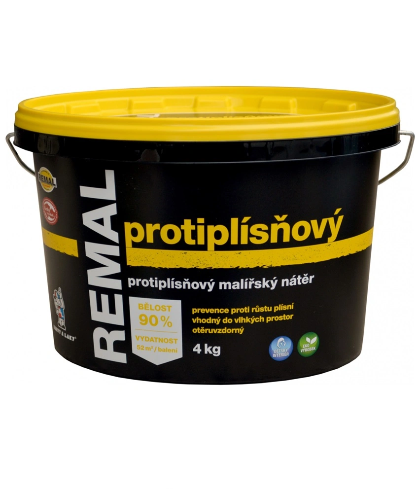 REMAL PROTIPLÍSŇOVÝ je vodouředitelná malířská tekutá barva s preventivním účinkem proti růstu plísní např. Penicillium glaucum, Chaetomium globosum, Aspergilus niger, Alternaria tenuis, Aureobasidium pullutans, Scletophona pityophila. Maximální preventivní účinnost je též proti houbám, kvasinkám, řasám a baktériím. Barva výborně kryje, je prodyšná, otěruvzdorná a má vysokou bělost 90 %. Používá se k protiplísňovým nátěrům omítek, betonu, sádrokartonu, cetris desek v interiérech. Barva vykazuje odolnost proti oděru za mokra – měřeno dle ČSN EN ISO 11998 – třída 5. (klasifikace dle EN 13300). Používejte protiplísňovou malířskou barvu bezpečně. Před použitím si vždy přečtěte údaje na obalu a připojené informace o přípravku.