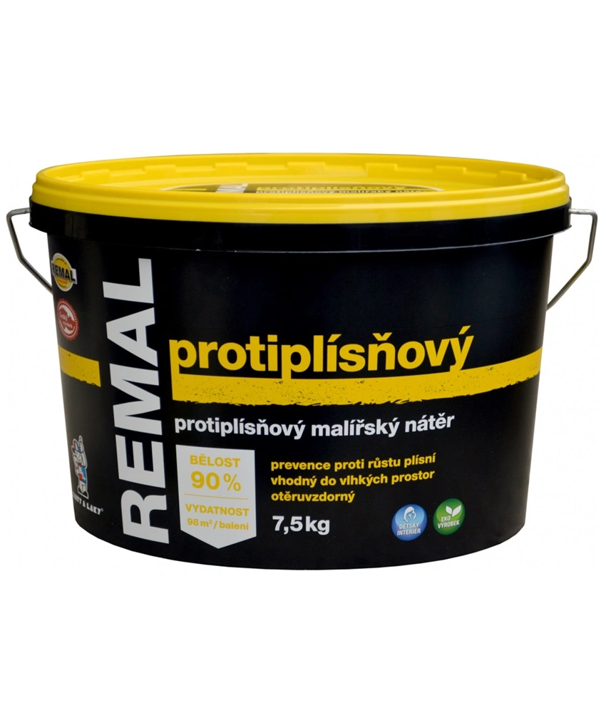 REMAL PROTIPLÍSŇOVÝ je vodouředitelná malířská tekutá barva s preventivním účinkem proti růstu plísní např. Penicillium glaucum, Chaetomium globosum, Aspergilus niger, Alternaria tenuis, Aureobasidium pullutans, Scletophona pityophila. Maximální preventivní účinnost je též proti houbám, kvasinkám, řasám a baktériím. Barva výborně kryje, je prodyšná, otěruvzdorná a má vysokou bělost 90 %. Používá se k protiplísňovým nátěrům omítek, betonu, sádrokartonu, cetris desek v interiérech. Barva vykazuje odolnost proti oděru za mokra – měřeno dle ČSN EN ISO 11998 – třída 5. (klasifikace dle EN 13300). Používejte protiplísňovou malířskou barvu bezpečně. Před použitím si vždy přečtěte údaje na obalu a připojené informace o přípravku.