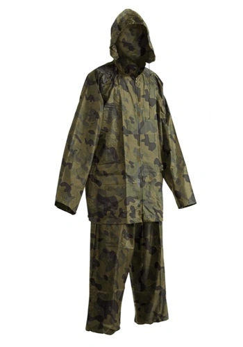 Voděodolný dvoudílný oblek – 3/4 plášť s kapucí a kalhoty v pase na gumu, všechny spojovací švy jsou zatavené, materiál s nánosem PVC, dvě přední kapsy kryté légami proti průniku vody, spodní část rukávů lze regulovat drukem, ventilace na zádech a v podpaží.