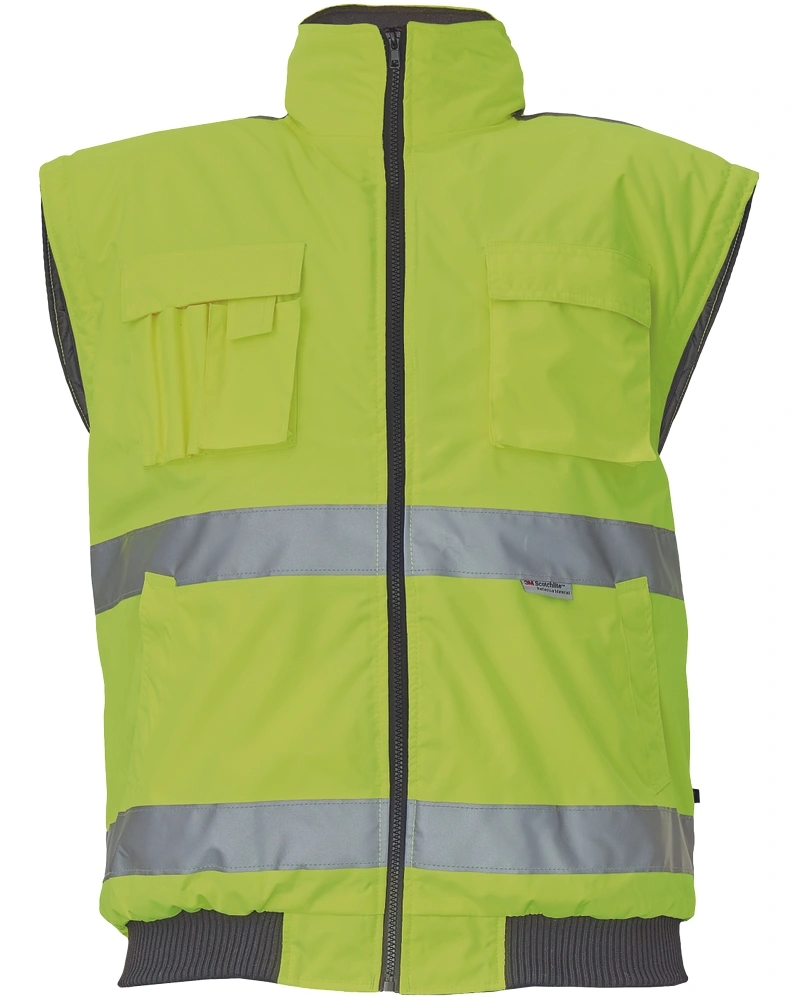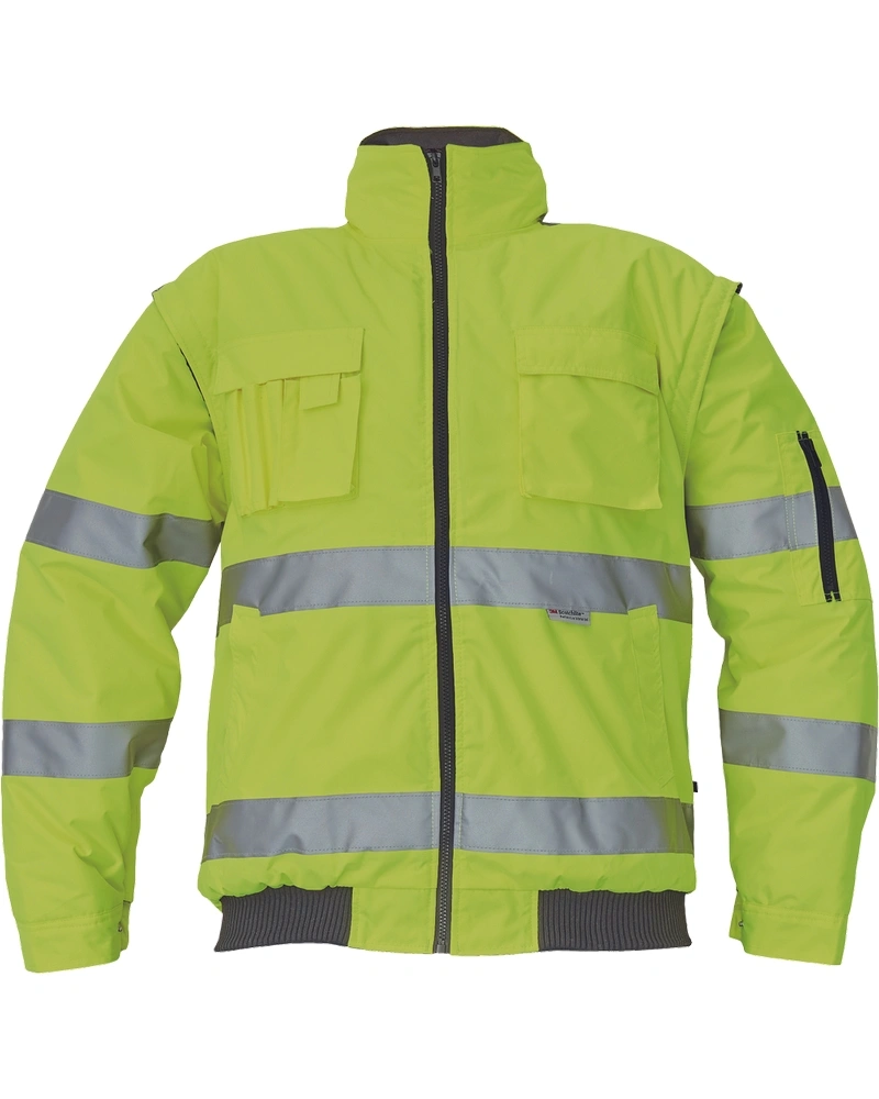 Hi-Vis bunda 2 v 1 s reflexními pruhy, odepínatelné rukávy a samostatně nositelná vesta, kapuce integrovaná v límci, podlepené švy, reflexní pásky 3M, voděodolnost tř. 3 dle normy EN 343 a paropropustnost tř. 1 dle normy.Více informací