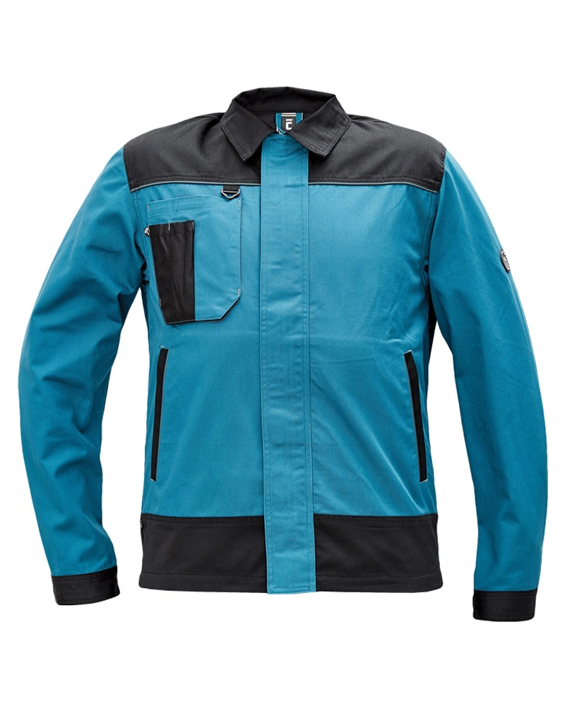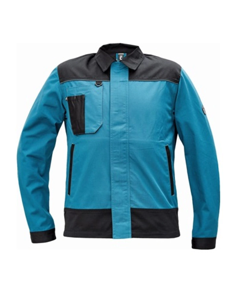 Pracovní bunda v moderním střihu. Multifunkční náprsní kapsa, 2 boční lištové kapsy. "D" kroužek, kontrastní paspulky, nastavitelná šíře rukávu na velcro. Zesílená oblast ramen materiálem Oxford.