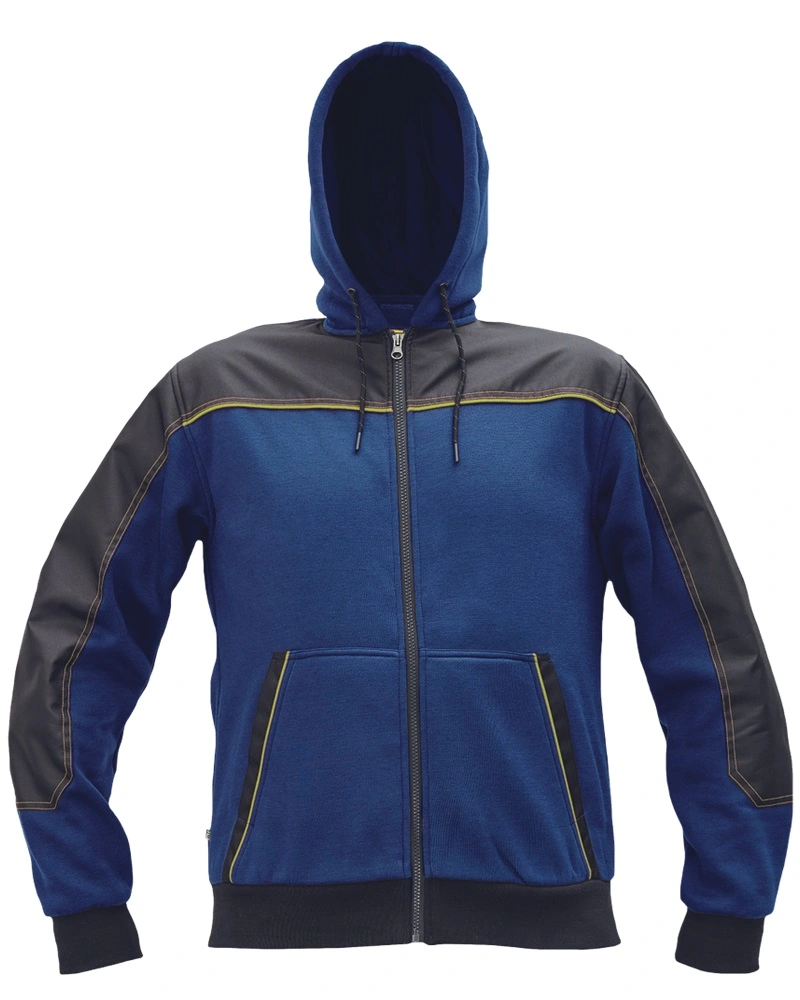 Celopropínací mikina na zip s kapucí. 2 přední klokaní kapsy. Kvalitní počesaný výplněk, zesílená oblast ramen a loktů z materiálu Oxford. Kontrastní paspulky, elastické žebrované náplety na rukávech a spodním obvodu.