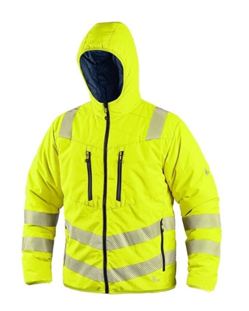 Pánská výstražná oboustranná bunda, zateplená. Kapuce napevno, rukávy a spodní lem do gumičky. Svrchní část má náprsní kapsy na zip, boční kapsy na zip a segmentované reflexní pásky. Vnitřní strana bundy má náprsní kapsu na zip, boční kapsy na zip, kontrastní žluté/oranžové a reflexní doplňky.Více informací