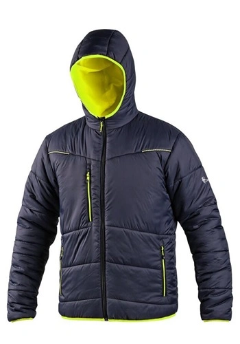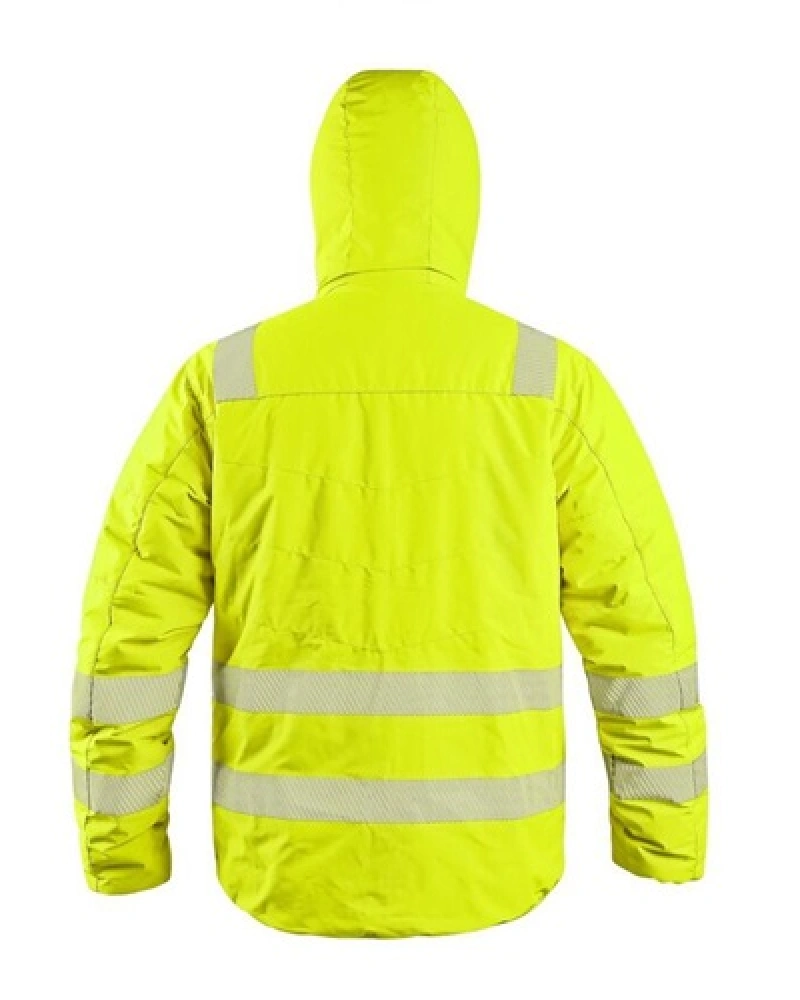 Pánská výstražná oboustranná bunda, zateplená. Kapuce napevno, rukávy a spodní lem do gumičky. Svrchní část má náprsní kapsy na zip, boční kapsy na zip a segmentované reflexní pásky. Vnitřní strana bundy má náprsní kapsu na zip, boční kapsy na zip, kontrastní žluté/oranžové a reflexní doplňky.