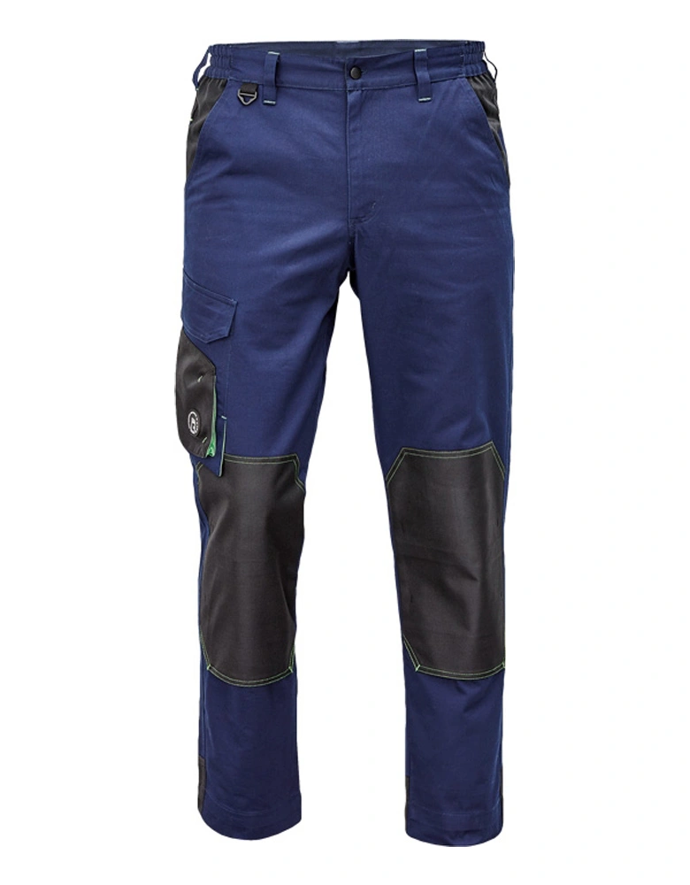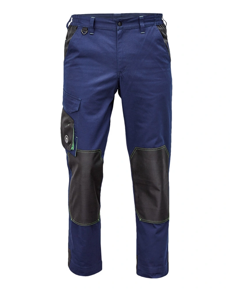 Laclové kalhoty pohodlného střihu a vysoké odolnosti, reflexní doplňky, zesílená zdvojená kolena pro vložení nákoleníků, kovové zipy a druky, poutko na kladivo, 4 poutka na drobné nářadí.
