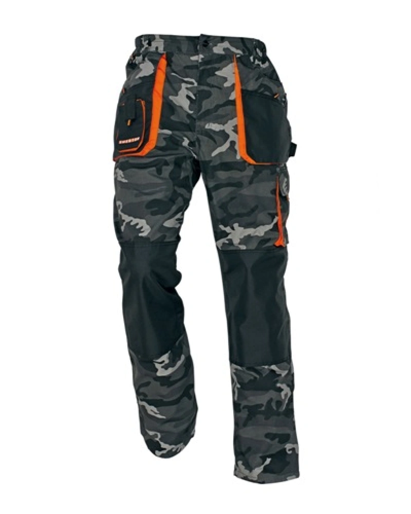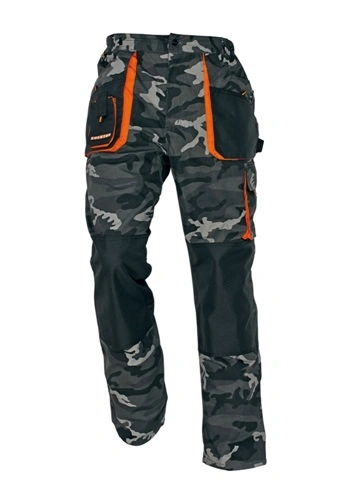 Pánské montérkové kalhoty, pas s poutky na opasek, vzadu do gumy, přední kapsy, boční kapsa na svinovací / skládací metr, boční kapsa na mobil / peněženku, zdvojená kolena, zadní kapsa s klopou, reflexní doplňky.