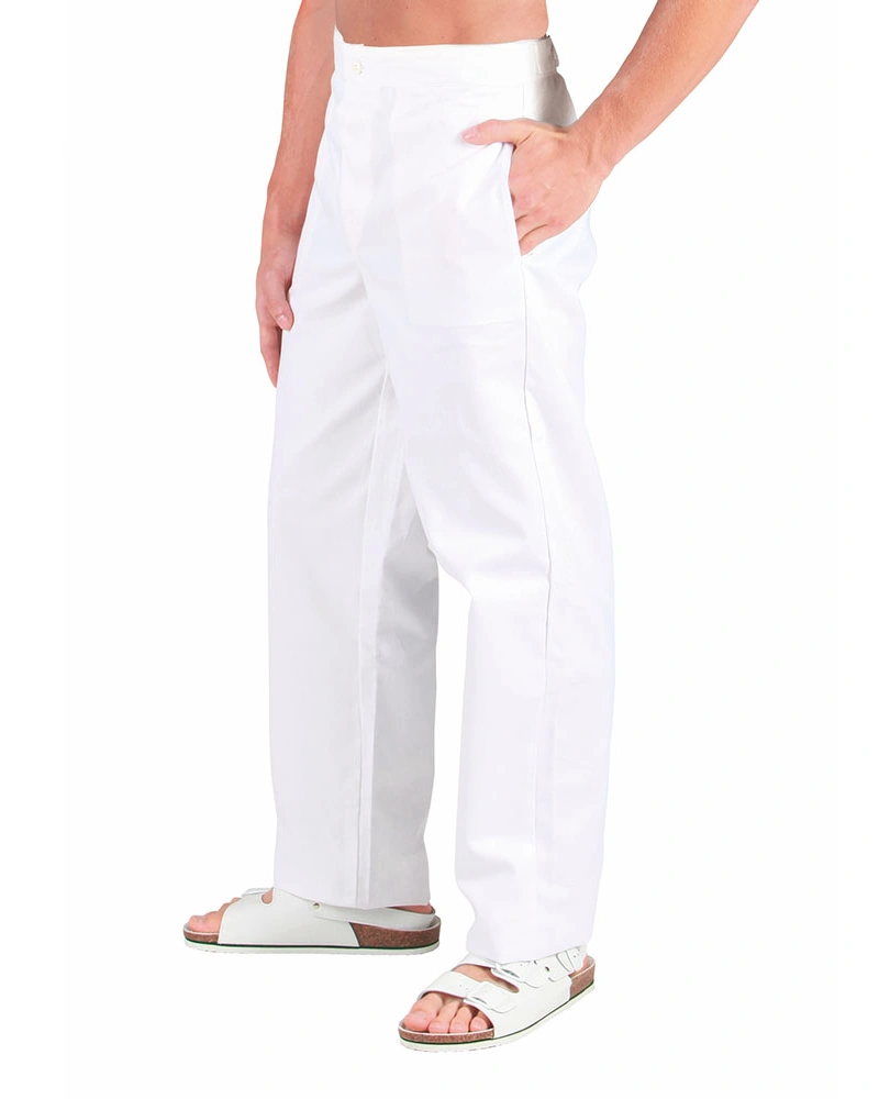 Kalhoty pro lékaře a zdravotníky do pásku se stahovačkami na knofliky. Rozparek na knoflíky. Boční kapsy ve švu. Zadní kapsa na knoflík.