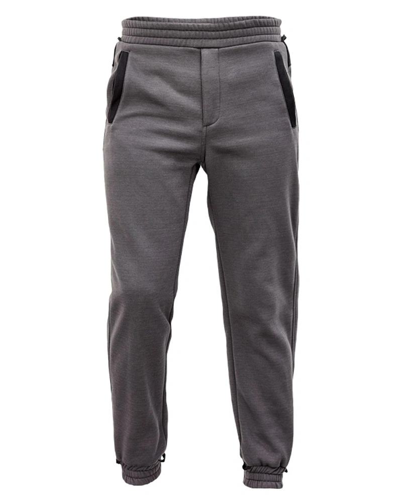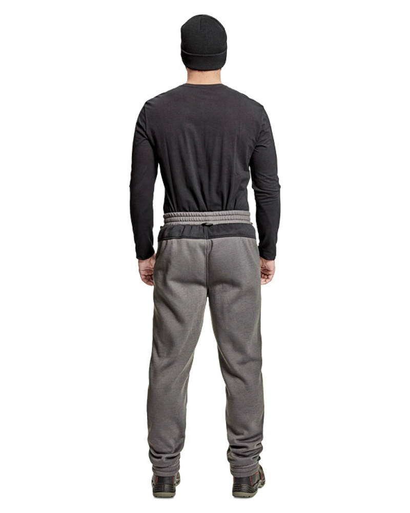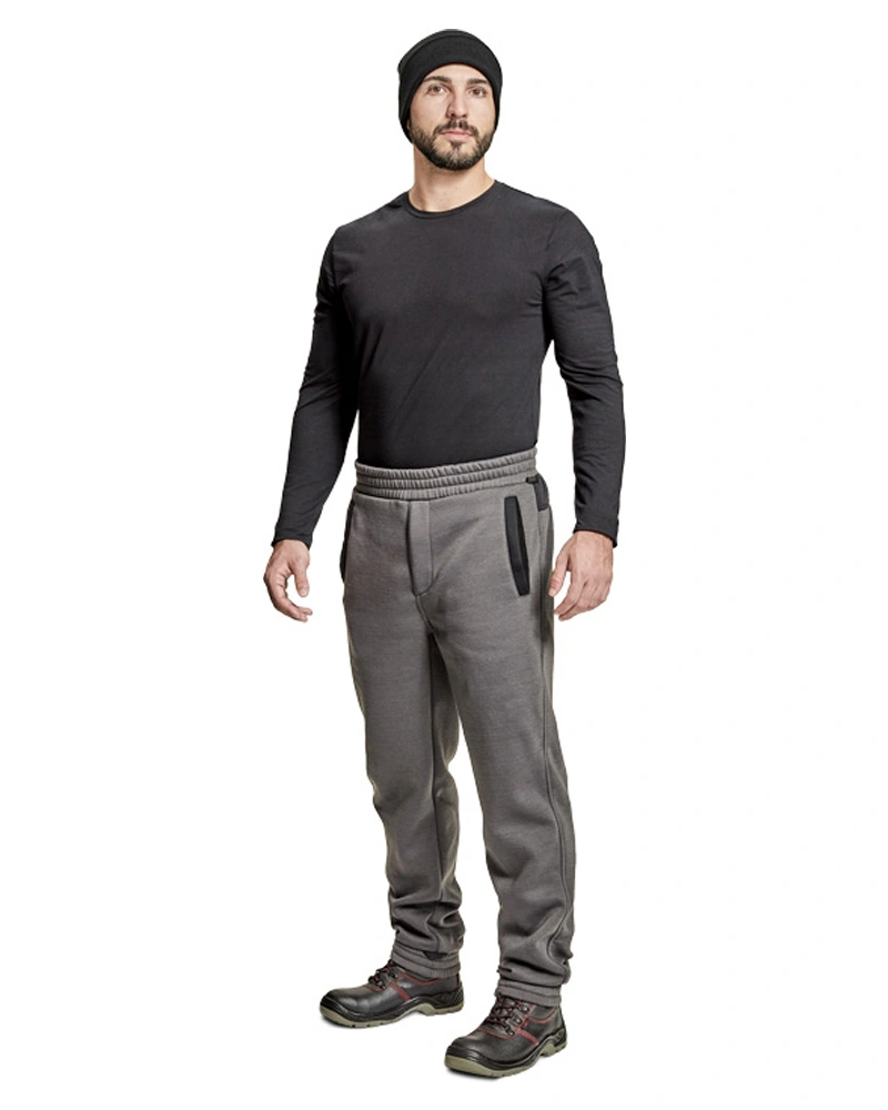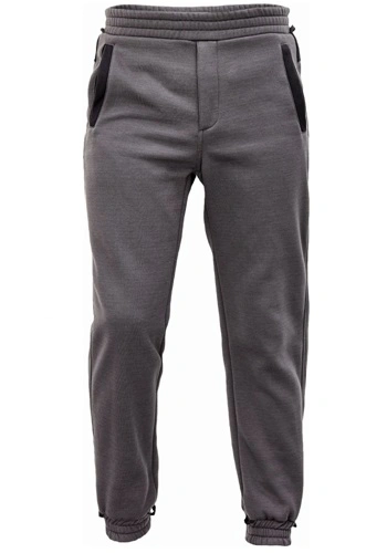 Tepláky s pružným pasem a spodním lemem nohavic. Postranní kapsy, poklopec na zip.