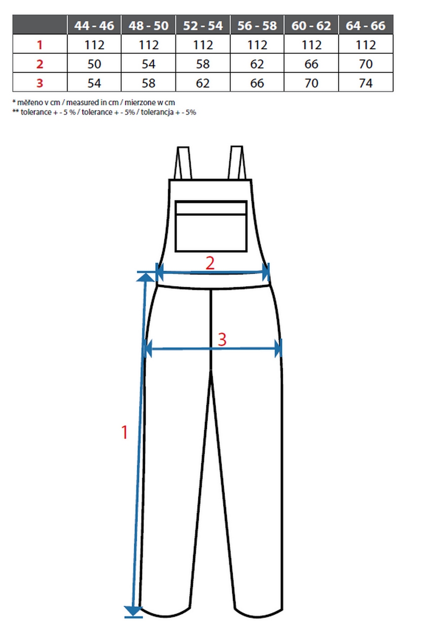 Pánské bavlněné pracovní kalhoty s laclem, 7 funkčních kapes, oboustranné zapínání v pase na knoflíky, polyester Oxford zesílení v kolenních částech s možností vkládání ochranných nákoleníků, nastavitelná délka nohavic.