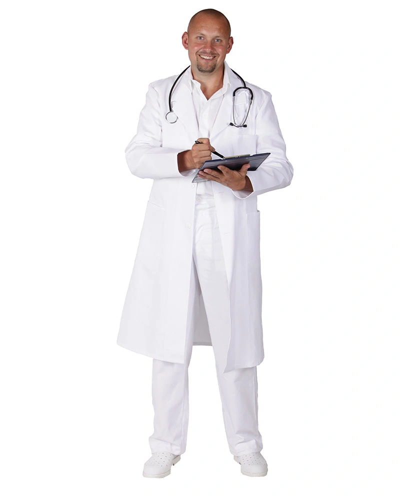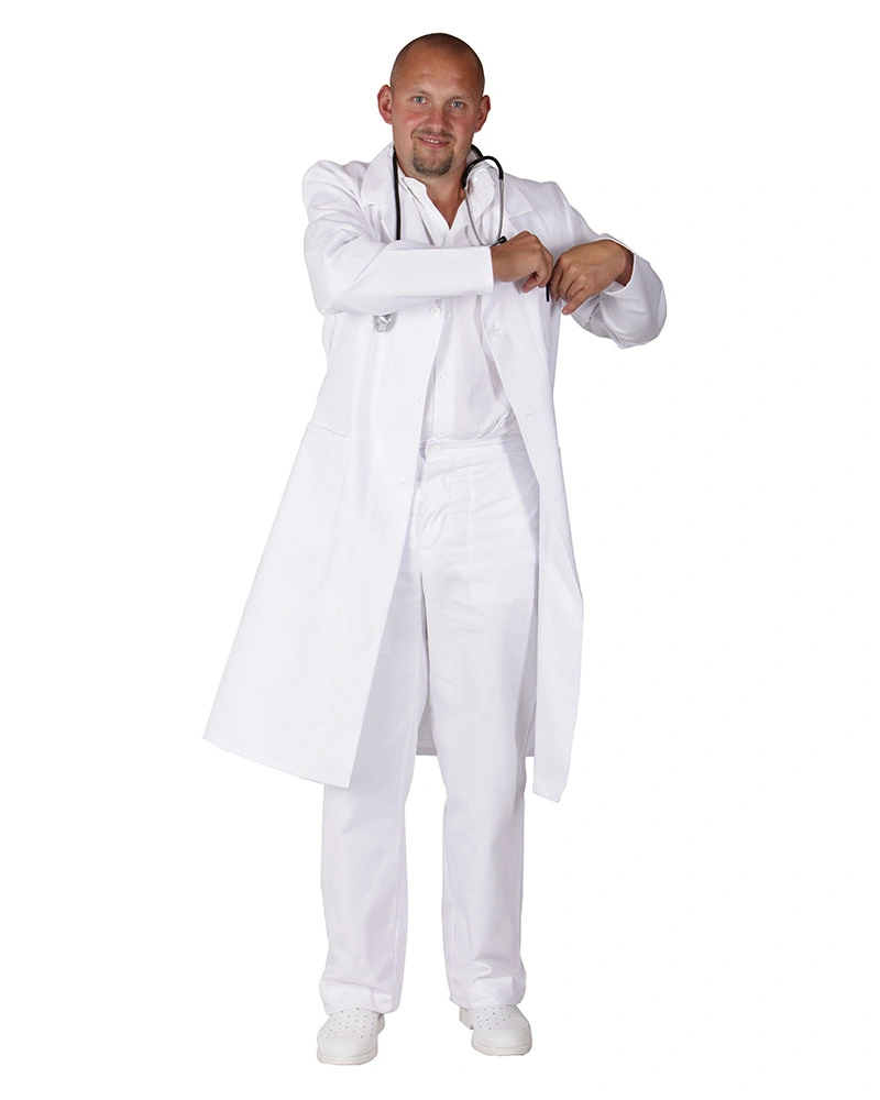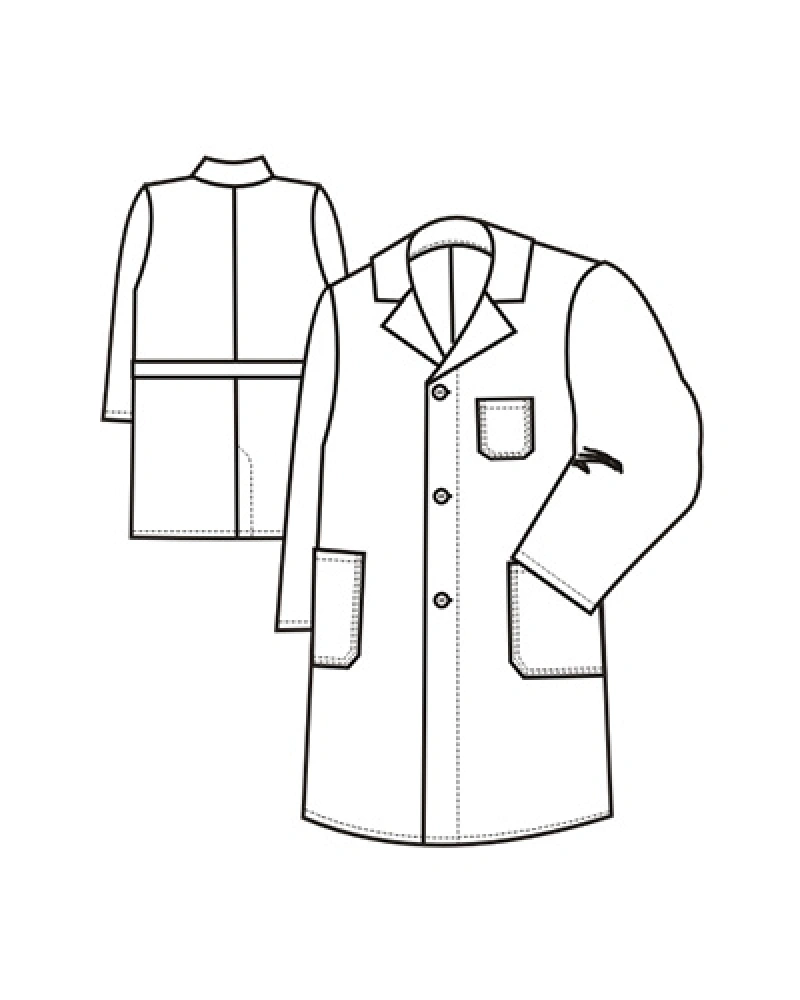 Klasicky lékařský plášť praktické délky ke kolenům.