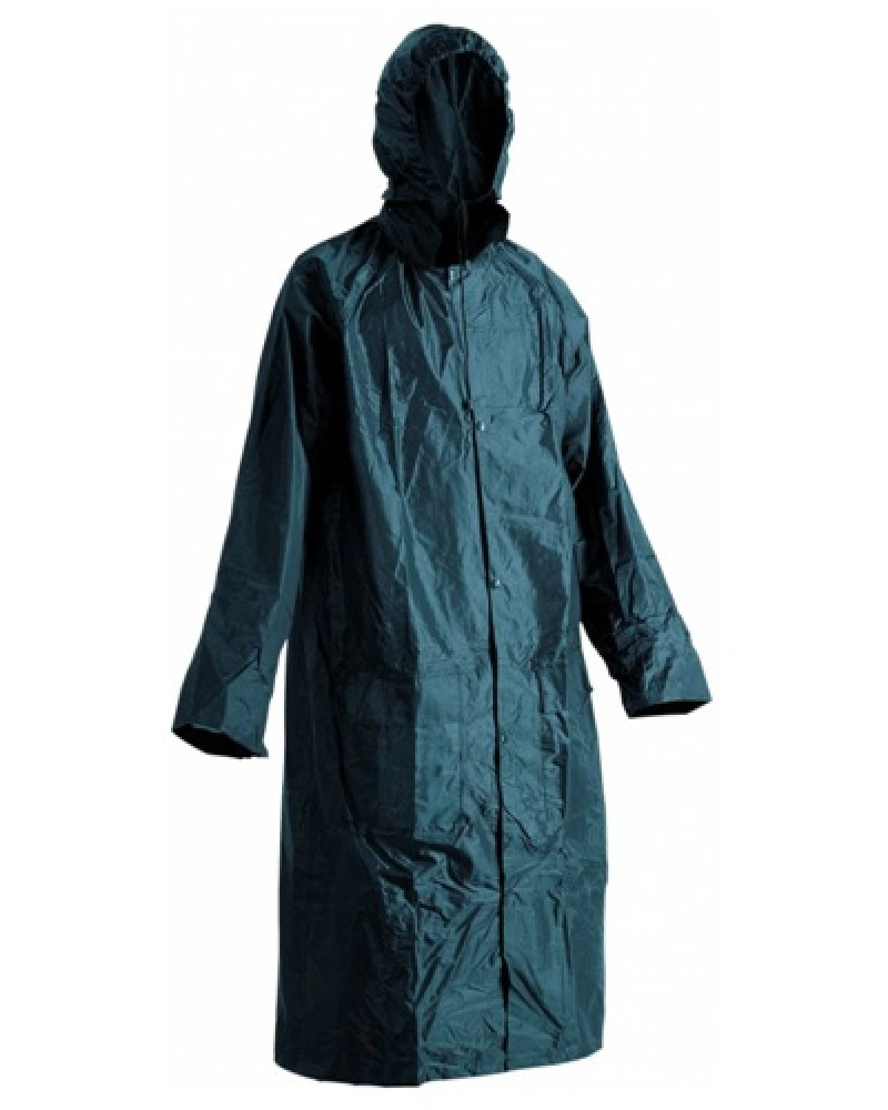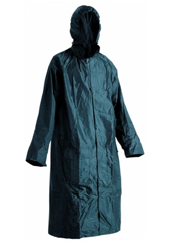 Nepromokavý a větruodolný plášť s kapucí v límci. Obvod kapuce lze stáhnout. Dvě přední kapsy s reflexní paspulí, spodní lem rukávů lze polohovat drukem. Délka 120 cm.