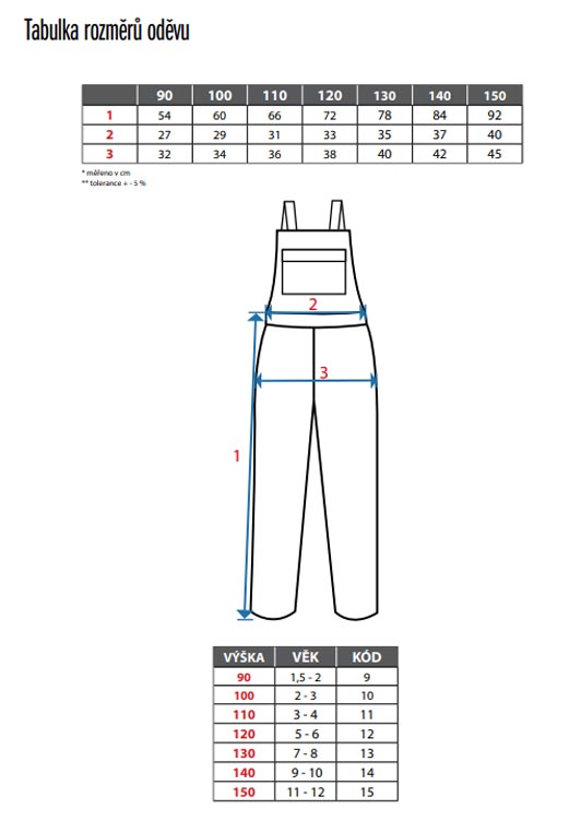 Dětské kalhoty s náprsenkou, z lehkého materiálu, náprsní kapsa na zip, boční zapínání na knoflíky, v zadní části guma s knoflíkem pro přizpůsobení velikosti, přední klínové kapsy, zadní jednoduchá kapsa, zesílená kolena, šle vzadu do gumy, reflexní doplňky.